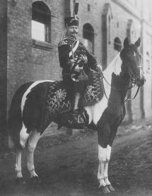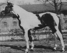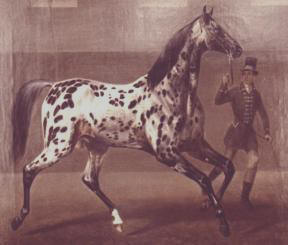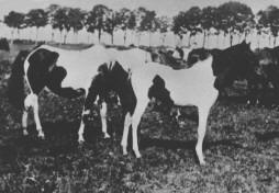 To receive a light fast and efficient cavalry horse, the existing population of mostly heavy horses was consequently bred to Oriental and English Thoroughbred stallions. Following his father on the throne, Frederic the Great ( 1712- 1786) began to supply Trakehnen's breeding population with light horses from Eastern European countries. Among these were also some colored horses which at that time were rather popular. Frederic the Great obviously had a weakness for spotted horses. |