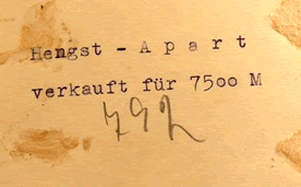 Ein Foto des ausgewachsenen Scheckhengst APART noch in Ostpreussen bei der Familie v. Knobloch. Er wurde dort für 7500 Reichsmark verkauft, wie der Rückseite des Fotos zu entnehmen ist. Herzlichen Dank an Frau Sybille von Knobloch, die in Kanada lebt. |