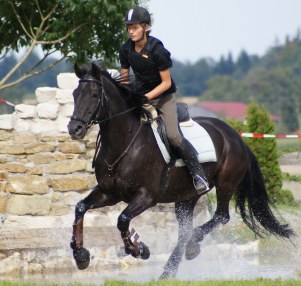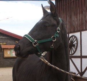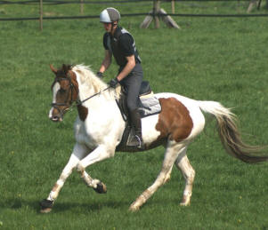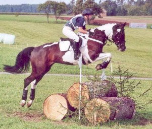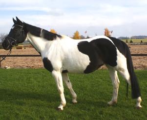 O Rappe, v. Makar a.d. Mandala v. Nil. Ebenfalls aus unserer Zucht und mit Kim überaus erfolgreich in der Vielseitigkeit, erlebt der 14 jährige Manco derzeit eine Ranaissance. Unter seiner neuen Besitzerin Gabi, die Manco für besondere Ereignisse Jan Mathias überläßt, einem jungen Reitschüler mit viel Begabung. Manco stammt von Makar a.d. Mandala, von 2 Scheckeltern und als er schwarz ohne Abzeichen zur Welt kam, war das aus unserer Sicht natürlich ein "Farbmanco". Bleibt dennoch festzustellen: Die Farbe ist eine wunderschöne Zugabe der Natur, man reitet allerdings auf einem Pferd und nicht auf der Farbe. |