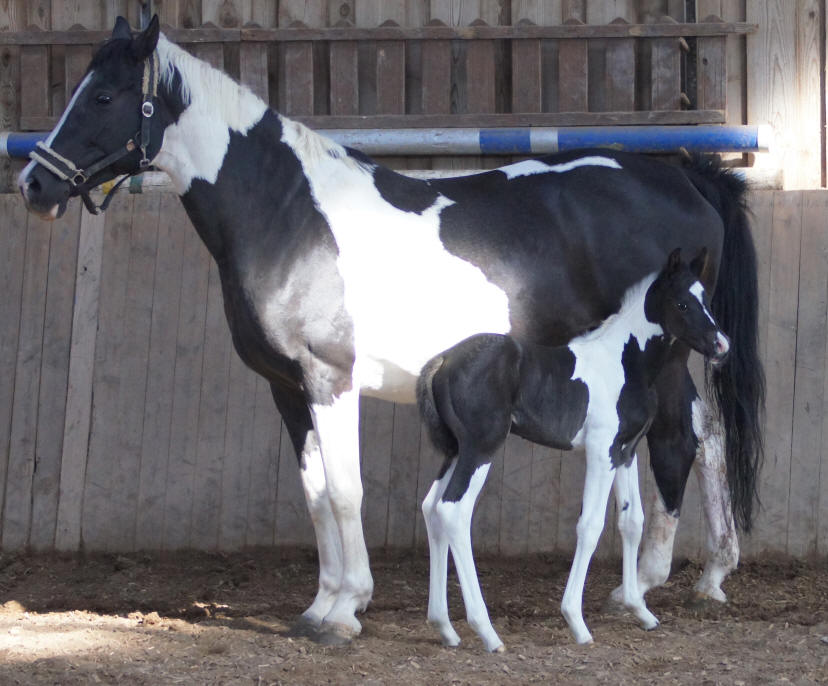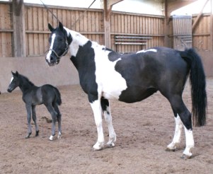 I S M A Zuchtstute und Schulpferd, v. Makar, a.d. Czumiza, v.Nil, hier mit ihrem 2010 geb, Fohlen von "Kronprinz". Der kleine Rappscheck Hengst dürfte der einzig gescheckte Nachkomme von Kronprinz sein, der 2010 eingegangen ist. Charisma verfügt über gute Springeigenschaften, die sie hoffentlich weitergibt. Sie hatte bereits vor 10 Jahren ein Rappscheckfohlen von Sixtus, das leider zu früh kam. Schöne Stute, ausgeprägtes Muttertier. |