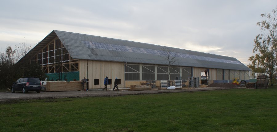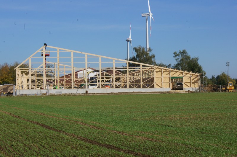 KAPITEL III "Morgen kommen die Zimmerleute - die werden da nicht reinfahren !" Unkte einer..... Die Antwort und Lösung: Schotter ! Schotter, Schotter und nochmals Schotter. Von morgens 8 bis abends 5 Uhr. Dank Erdbauprofi Charly Hölldampf und Bruder "Buddha" ... Nebenbei wurde soviel Pfützenwasser wie möglich abgepumpt. ![]() ![]() Am Abend sah's dann sehr ermutigend aus. ![]() Dann zunächst die Anlieferung des "Travohäuschens" (4t) für die Voltaik durch die EnBw ![]() Gleichzeitig Anlieferung der Holzkonstruktionselemente der Fa HIWO sowie von Spezialfahrzeugen der Firma Bayer ![]() Nach wenigen Stunden steht bereits der erste Aufbau, begleitet von teils heftigen Schauern, die gegen Abend dann nachließen. Geschafft wurde am 1. Tag bis in die Nacht ![]() ![]() Kunst am Bau Tag 2 Es geht flott voran, wie der Panoramablick bestätigt. ![]() Aufstellen der tonnenschweren Stahl - Hauptträger (4 Stück) und weiterer Wände sowie des Westgiebels ![]() ![]() Die Stahlträger werden in das dafür vorgesehene Loch im Fundament einbetoniert ![]() Bereits erkennbar - die zukünftige Stallgasse ![]() Fast Fertig: Der Westgiebel ![]() ![]() ![]() Nochmals die zukünftige Stallgasse Es schüttete wieder einmal aus Kübeln Die Zimmerleute leisteten trotzdem ganze Arbeit Hier werden die Leimbinder gerade in der zukünftigen Stallgasse angebracht. ![]() Stall am Abend - fast fertig! Fehlen nur noch die Pferde... die Enten sind schon da... ![]() Stallwand zur Reithalle ![]() Die Pfetten sind befestigt, Dachrinnen montiert, das komplette Stallgebäude wird bereits gedeckt. ![]() Die Südseite Petrus zeigt sich endlich mal wieder von seiner besten Seite - über 20° ![]() ![]() Ansicht von Westen - bald kommen die Leimbinder dran ![]() Der Stalltrakt ist inzwischen komplett gedeckt. Irgendwie erinnert das Ganze an das Kollosseum ... ![]() Der Ostgiebel ist fast fertig - wo man hinsieht: Hunderte Tonnen Balken und jede Menge Fachwerk ![]() Rohbau für Toiletten, Aufenhaltsräume - ein bisschen Innenausbau, Pfetten Vorbereitung für die Dachkonstruktion - und Freitag Nacht kommen die ersten Binder, jeder 30 m lang und 4 Tonnen schwer. Die Nordseite ![]() Pause, nach harter Arbeit. Da darf auch mal bei 20 Grad im Schatten der Durst gelöscht werden, obwohl es noch bis zum Dunkelwerden weiterging: Die Jungs von der Zimmerei Bayer (Thomas und Attila fehlen) - absolutes Timing, perfekter Überblick und beste Organisation, vor allen Dingen angesichts eines derart gewaltigen und umfangreichen Projektes. Chapeau und Danke Schön ! ![]() Die 4 Leimbinder und der 45 Tonnen Kranwagen sind da. Jeder Binder wiegt 4 Tonnen ![]() Giganten ! 30 m in einem Stück, unglaublich ![]() ![]() Der Autokran - ein 45 Tonner ![]() dann schwebt das Teil elegant, um gleich verankert zu werden ![]() Wow ! 30 Meter, 4 Tonnen, als wär's nichts... ![]() Da schwebt auch der Zimmermann, mitsamt dem Riesenteil am Bändel, locker, gekonnt, elegant... ![]() Zu erkennen: Die späteren Räumlichkeiten ![]() ![]() parallel zum Dachdecken -, die Voltaik Profis. Sie läuten das KAPITEL V ein, die Foto-Voltaik Installation ![]() Hunderte Meter Schienen zur Befestigung der Module müssen gelegt werden ![]() Montag, 23.10. Weitere 5 Leimbinder Montage am Westgiebel - 2 sind bereits angebracht, 3 liegen noch, aber nicht mehr lange ![]() ![]() Nur authentisch mit dem Löffel Dienstag, 23.10. Von den fehlenden 5 Leimbindern sind 4 bereits eingebaut, der letzte von allen wird hier angehoben... ![]() eingefädelt... ![]() und dann bekam der Kranwagen zu guter Letzt leichtes Übergewicht und fing an zu kippeln. Keine Panik - Der Binder wurde schnell aufgelegt und dann mit Vorschlaghammer und gutem Zureden in Position gebracht. ![]() Von oben wurde der Leimbinder von Superman Stocki mit ganzer Manneskraft abgestützt. ![]() Nach der letzten Leimbinder Aktion - ein Durchblick von Innen ![]() ![]() Mittwoch, 24.10. Ansicht von Südwesten: Gut zu erkennen: Rechts Dach gedeckt und bereits Schienen für die Module gelegt. Mitte: Pfetten fehlen noch, Links: Bereits mit Pfetten. ![]() Donnerstag, 25.10 Konzertierte Aktion: Während die einen das Dach bis auf wenige Meter fertig decken ... ...legen die anderen bereits die Module ![]() Herbstlich ist es geworden - dennoch ein großes Danke Schön an Petrus, der immer wieder ein paar versöhnliche Tage einfließen ließ ![]() Freitag, 26.10. Das Süd-Dach ist nun komplett gedeckt, jetzt gehört den Voltaikprofis das restliche "Feld". Etwa 1/4 der Dachfläche wurde bereits mit Modulen versehen, wie auf dem Foto zu erkennen ist. Der Wettlauf mit der Zeit neigt sich dem Ende zu. Noch 5 Tage. Bis zum 1. November muß die Anlage angeschlossen sein. Das ist rekordverdächtig und letztlich allen beteiligten Firmen durch ihrem großen Einsatz zu verdanken, insbesondere der Scherer Mannschaft, die bei Schnee und Eis auch noch die sogenannte Arschkarte gezogen hatten. Ohne ihren Einsatz wäre der Einspeichertermin geplatzt... Übrigens, was sollen die vielen Becher? ![]() Falk fragen ! Das Bayer Team v.l.: Stocki, Bernd, Johannes, Andy, Falk, der Bauherr, sowie Attila und Thomas. ![]() Samstag, 27.10. Die Voltaikinstallateure um K.H. Scherer und "Sir Robert" beim Verlegen der Unterkonstruktion ![]() Nach schönstem Kaiserwetter, keine 12 Stunden später: Schneetreiben und schneidende Kälte. Sie waren wirklich gefordert - Dafür gibt's dann den Gefrierfleisch Orden.... Danke Roman und den Helden vom 28.10. - das werden wir nie vergessen ! ![]() Sonntag / Montag Alles Paletti - trotz der sibirischen Verhältnisse ![]() Das ist nicht selbstverständlich! ![]() Während oben die Module gelegt werden... ![]() ... werden unten bereits die Boxen installiert ![]() Die zukünftige Stallgasse am Montag morgen. Dienstag, 30 Oktober Geschafft! Zwischenzeitlich sind alle Module auf dem Dach. 380 KW können nun rechtzeitig ans Netz gehen! ![]() Die Nordseite Wie zu erkennen ist, sind die Pfetten des Norddaches größtenteils instal